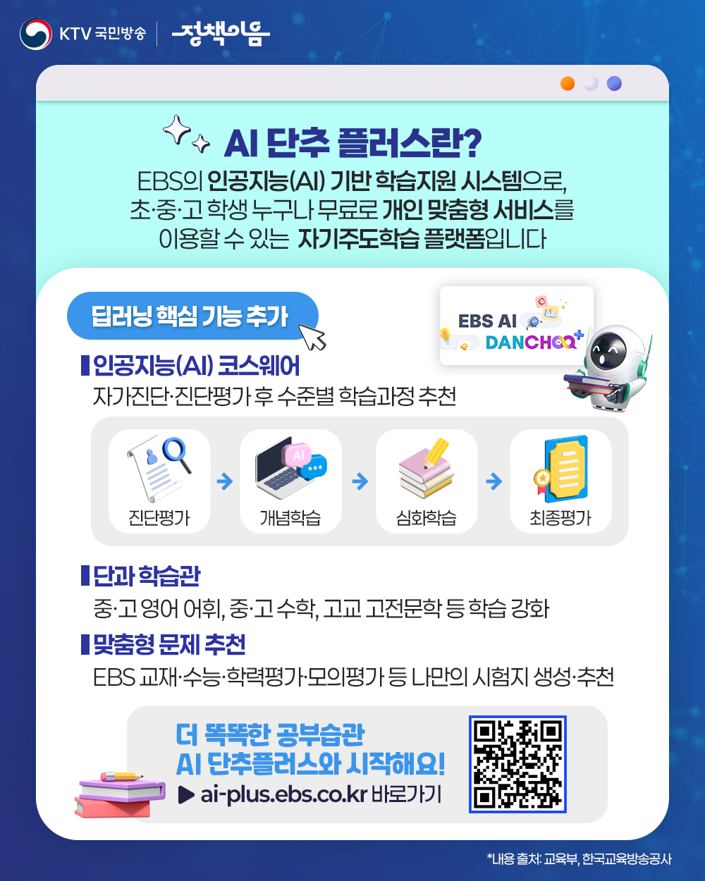 지금 바로 공식 누리집(https://ai-plus.ebs.co.kr)에 접속해 국어, 수학, 영어, 사회, 과학, 역사, 한국사 등 교과별 학습콘텐츠를 무료로 이용해 보세요~