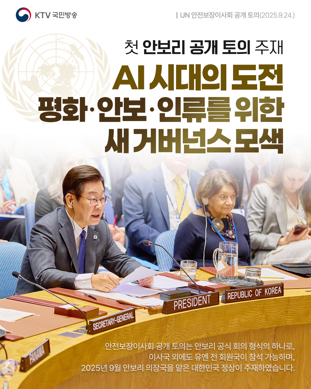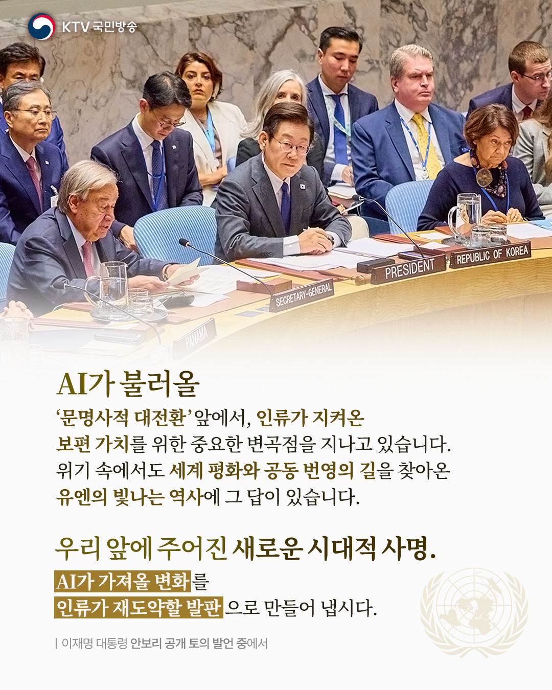 이 대통령은 AI 시대에 유일하고도 현명한 대처는 “국익을 위해서 경쟁하되 모두의 이익을 위해 협력하는 것”이라며, “특히 안보리의 역할과 책임이 더욱 막중해졌다”라고 밝혔는데요.