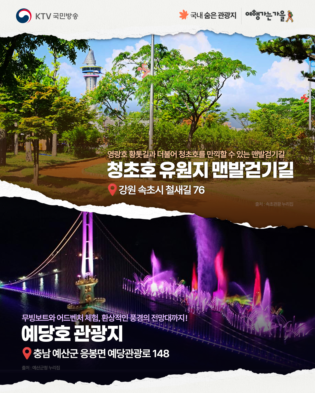 전국 곳곳의 숨은 관광지에서 탁 트인 자연과 여유로운 가을의 감동을 만나보세요.