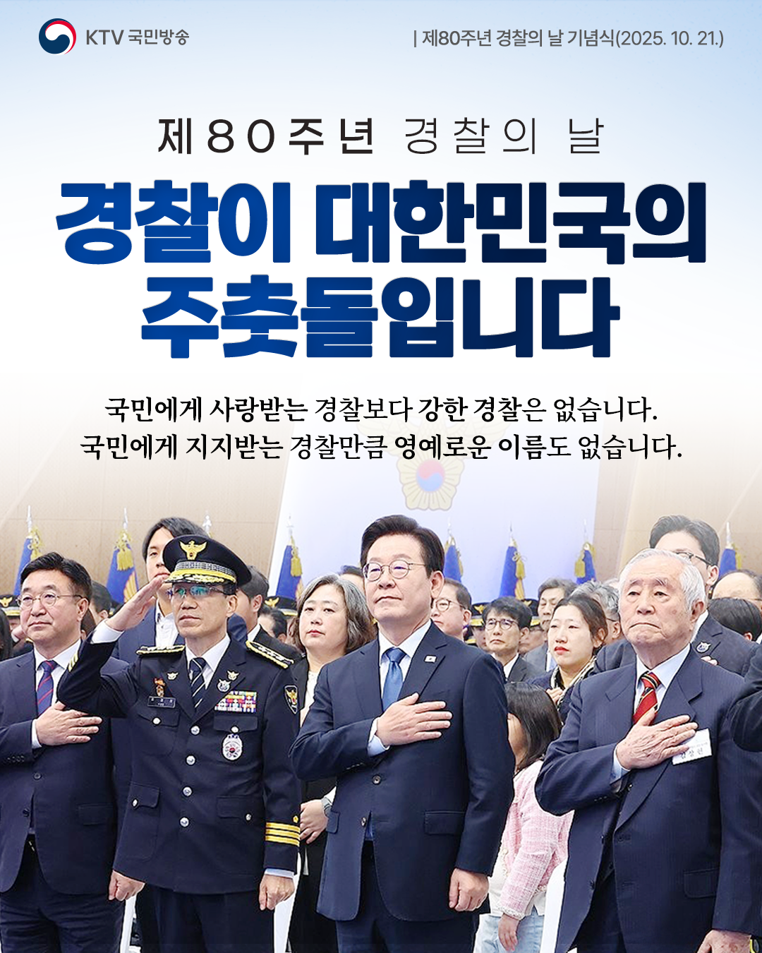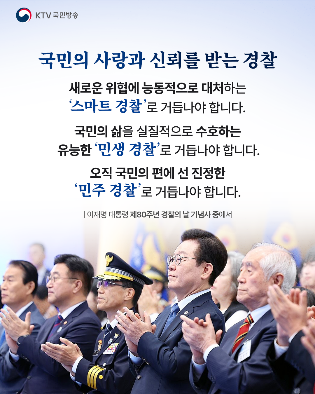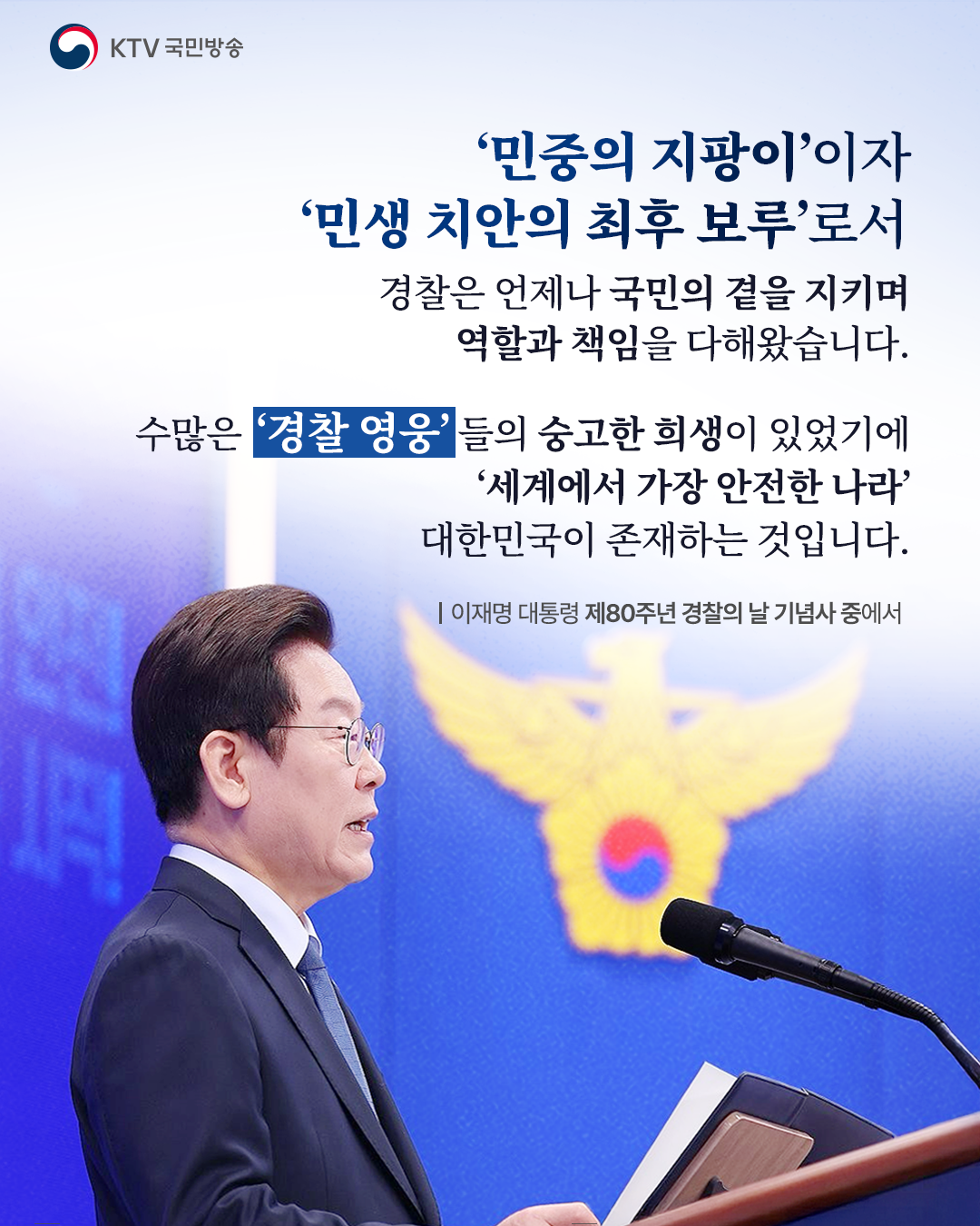 이 대통령은 기념사를 통해 “대한민국이 80년간 일궈낸 눈부신 성취의 바탕에는 여러분 경찰관들의 희생과 헌신이 단단하게 자리하고 있었다”며, “지금 이 순간에도 천금같이 귀한 우리 국민의 생명을 구하기 위해 고군분투하고 있는 경찰관 여러분들이 자랑스럽다”고 밝혔습니다.