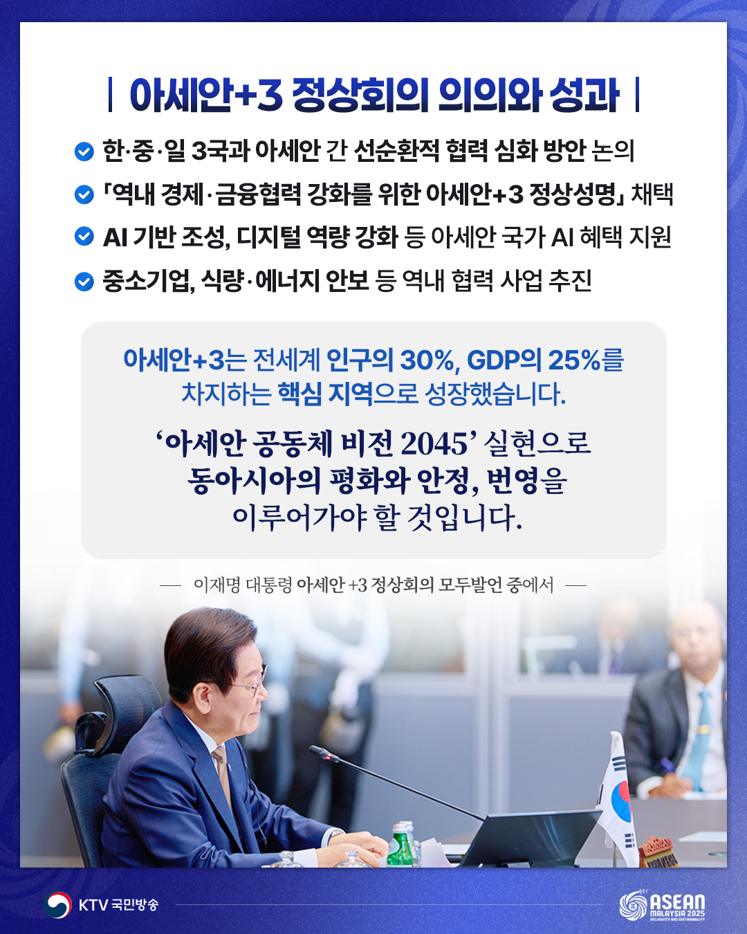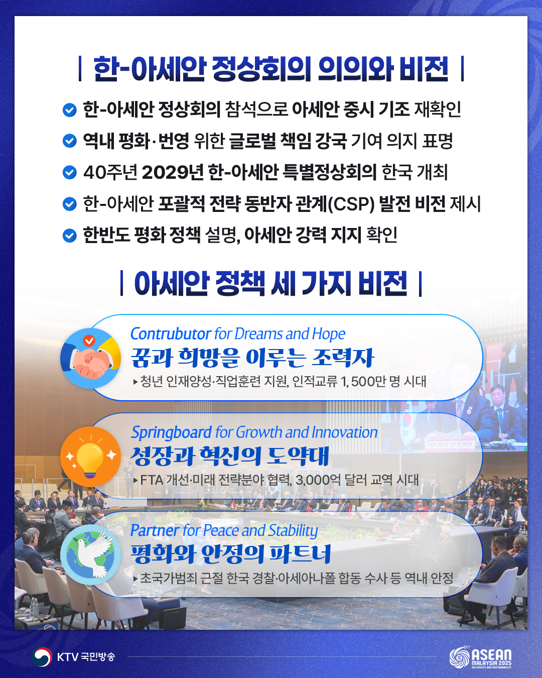이와 함께 대한민국이 아세안과 함께 지속가능한 발전, 미래세대 양성, 역내 평화와 번영을 위해 지속적으로 협력하겠다고 밝혔습니다.