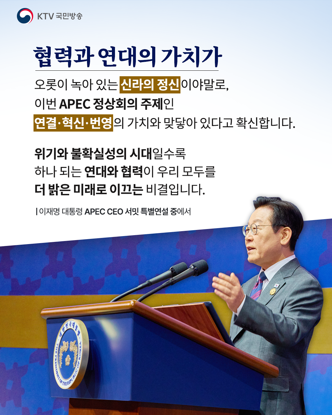 또한 “패권 경쟁과 외세의 압박 속에서도 천년왕국 신라는 외부 문화와의 교류, 개방을 멈추지 않았다”라며, “신라의 정신이야말로 이번 APEC 정상회의 주제인 연결·혁신·번영의 가치와 맞닿아 있다”라고 강조했습니다.