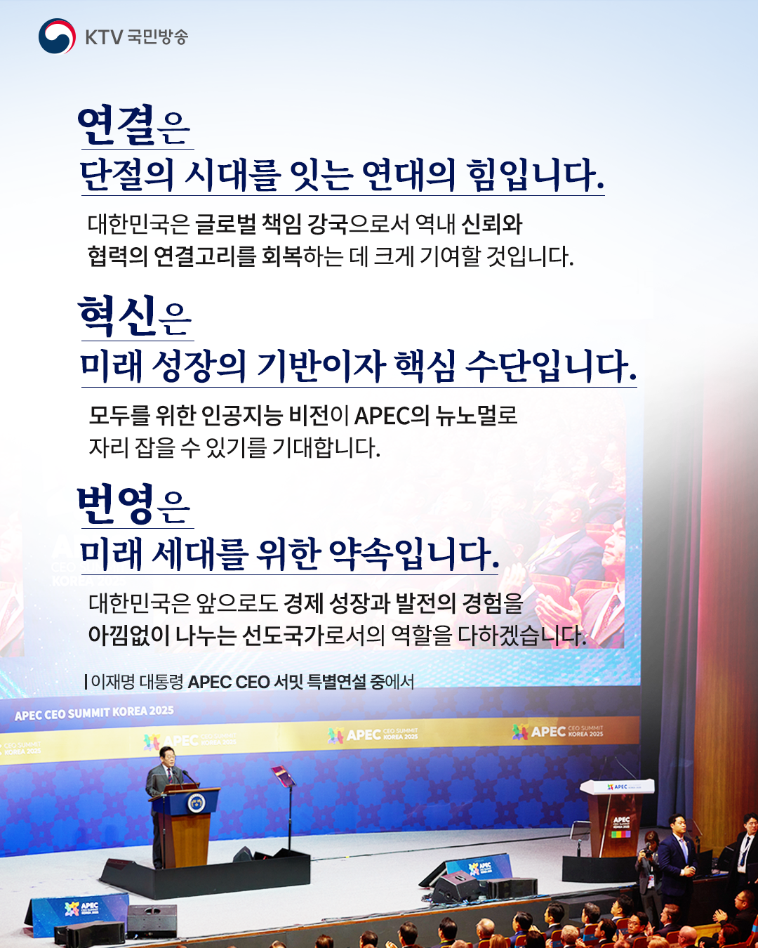 이 대통령은 “APEC은 위기의 순간마다 서로의 손을 잡고 연대하며 ‘상호 신뢰’가 ‘상호 번영’의 지름길임을 입증해왔다”라며, “대한민국은 의장국으로서 위기에 맞서 다자주의적 협력의 길을 선도하겠다”라고 밝혔는데요.