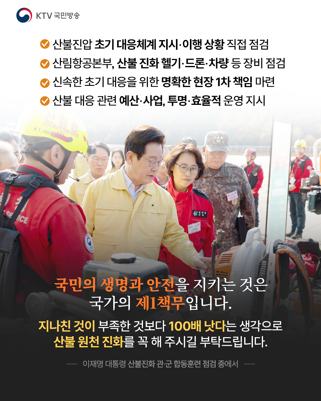 “산불이 발생했을 때 초기에 신속하게 대응할 수 있도록 현장의 1차 책임을 명확히 하라”고 지시하는 한편, “지나친 것이 부족한 것보다 100배 낫다는 생각으로 과잉이다 싶을 만큼 조기 대응해 줄 것”을 당부했습니다.