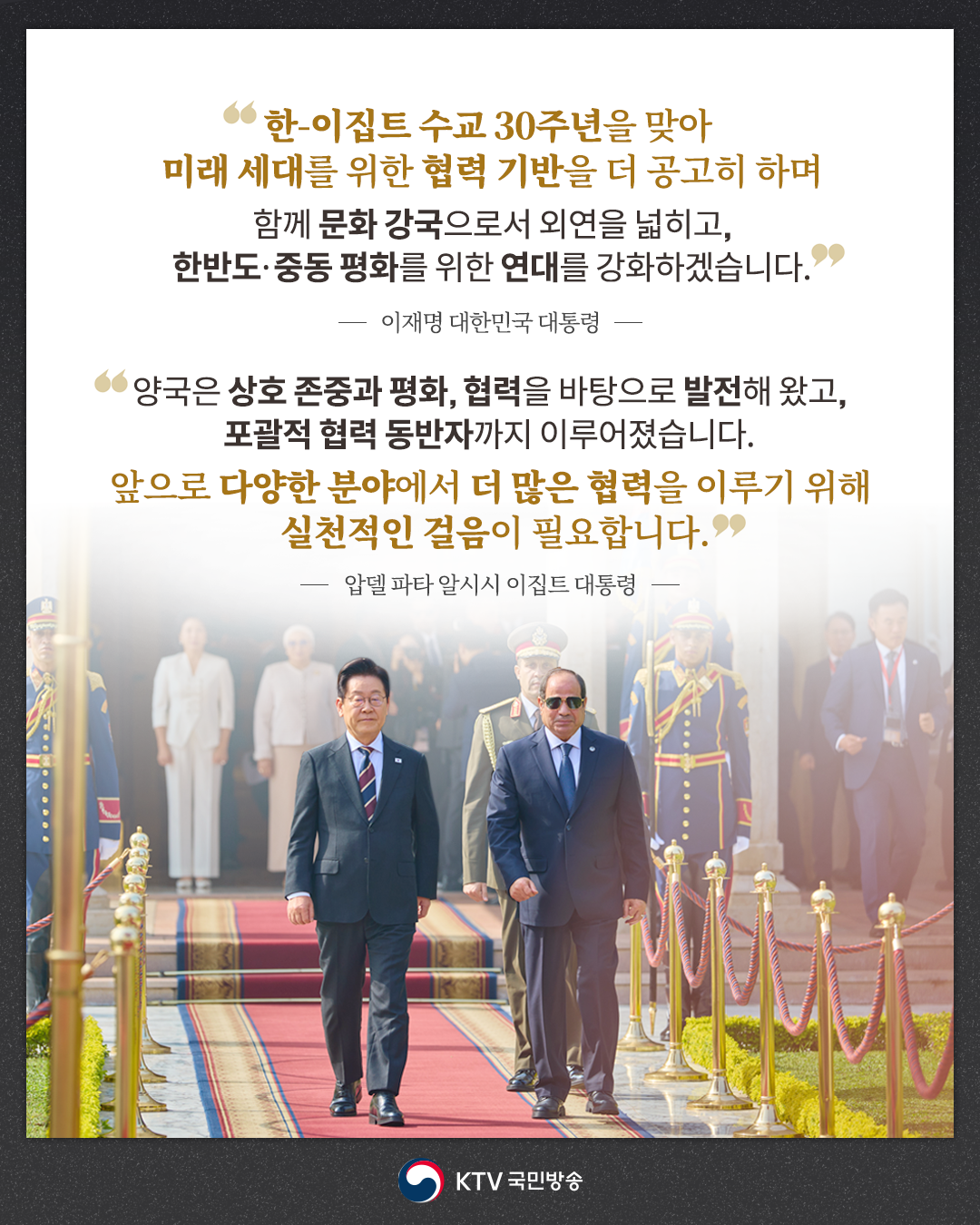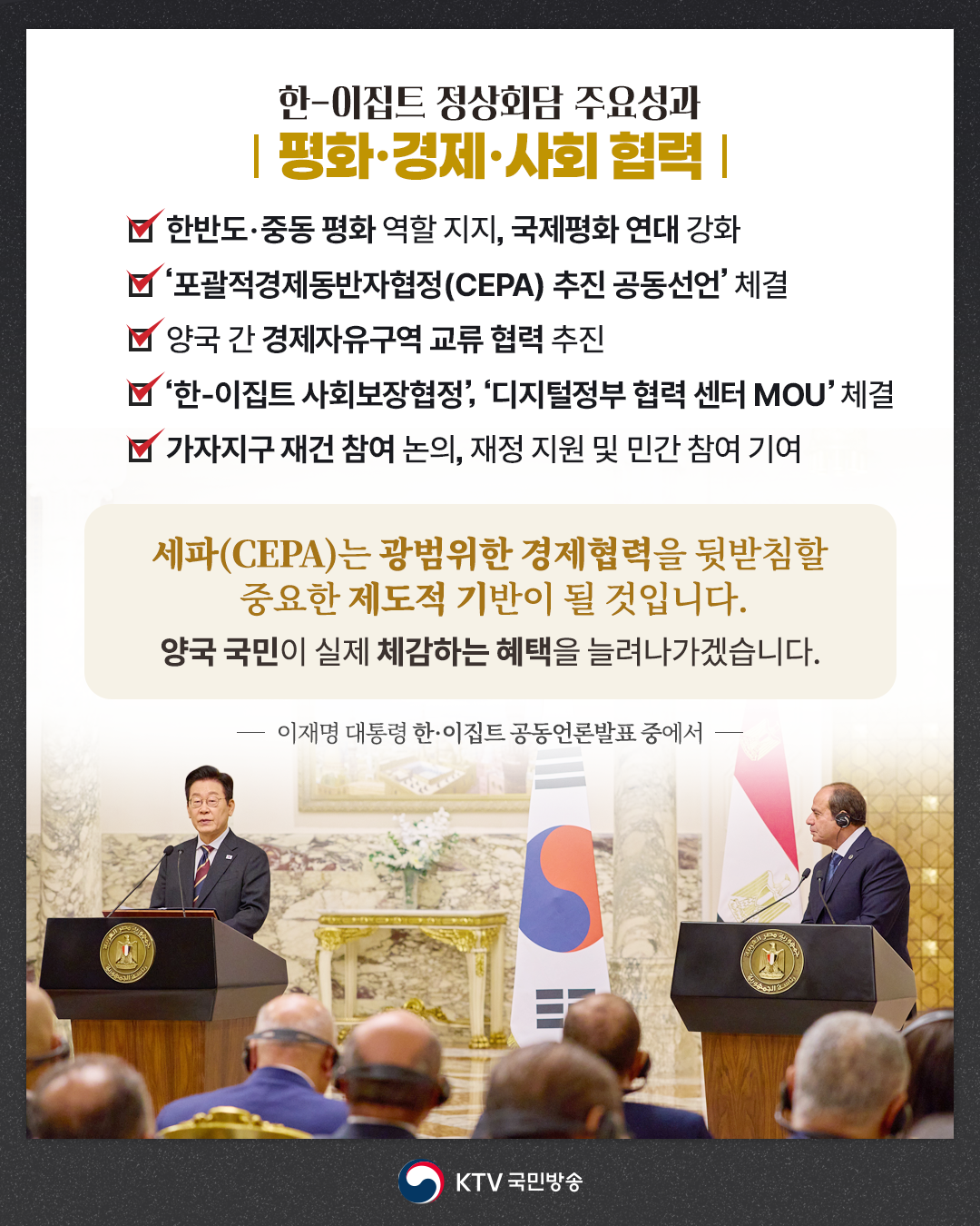 알시시 대통령은 “이집트 내에 활동하는 한국기업들이 사업의 규모를 확대하고, 더 많은 투자를 할 것을 초대한다”라며, “새로운 기업들도 이집트 시장에 돌입하기를 바란다”라고 말했습니다.
