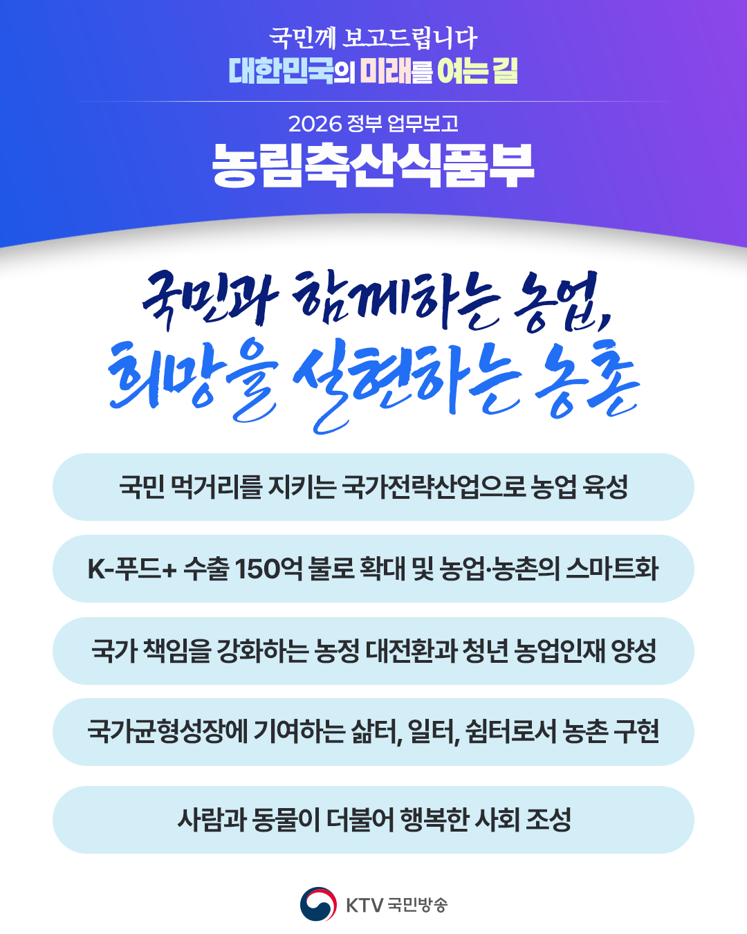 - K-푸드+ 수출 150억 불로 확대 및 농업·농촌의 스마트화