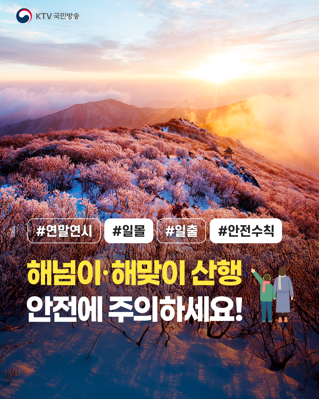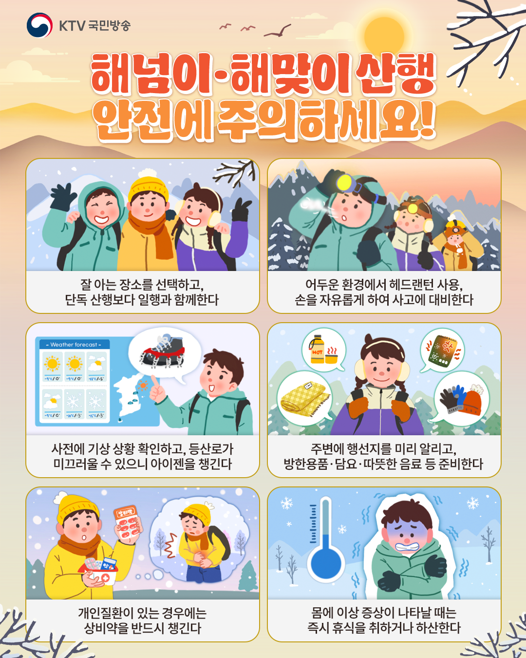 해넘이 후 하산하거나 해맞이를 위해 이른 새벽에 이동하는 경우 기온이 낮아 동상이나 저체온증에 노출되기 쉽고, 어두운 상태의 등산로는 얼어 있어 각별한 주의가 필요합니다.