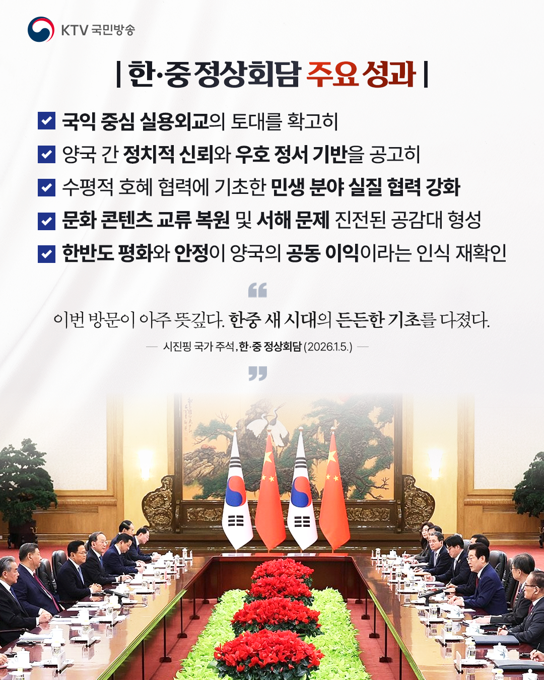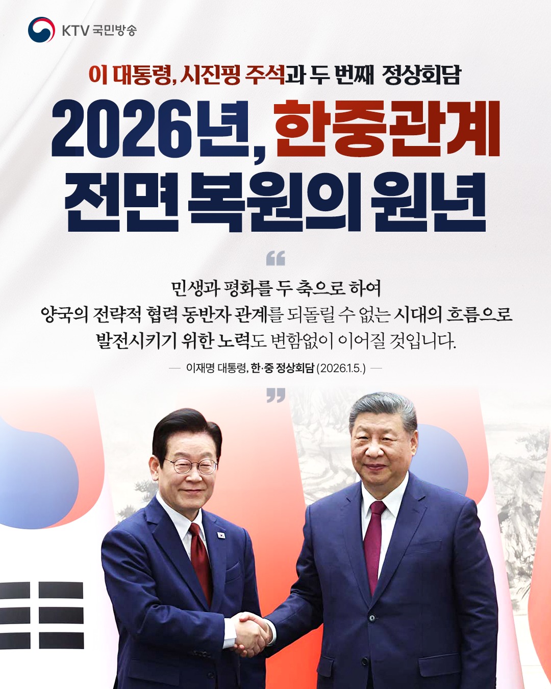 이재명 대통령은 1월 5일, 시진핑 주석과 공식환영식, 정상회담, MOU 서명식, 국빈만찬으로 이어지는 국빈 방중 공식 일정을 함께했습니다.이번 정상회담에서는 양측 모두가 수용가능한 분야에서부터 점진적·단계적으로 문화·콘텐츠 교류를 확대해 나가자는 공감대 하에서 세부 사항에 대한 협의를 진전시켜 나가기로 했습니다.또한, 한반도 평화·안정이 한중 양국의 공동 이익이라는 인식을 재확인하고, 이를 위한 중국의 건설적 역할 수행 의지를 확인했습니다.