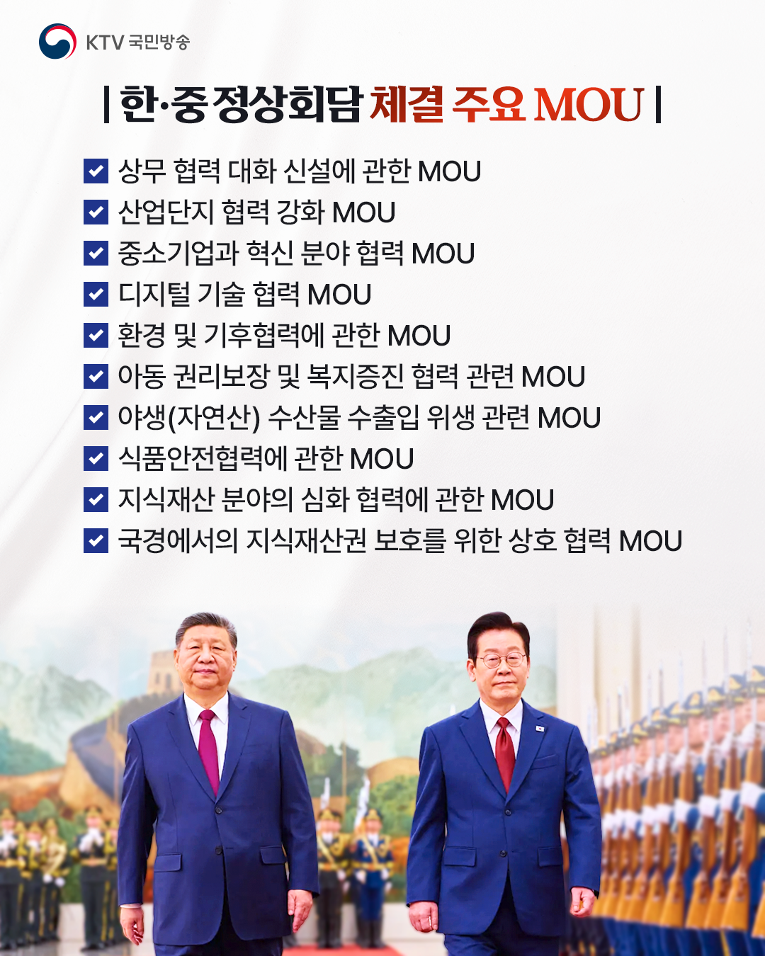 정상회담 직후에는 양국 정부부처·기관 간 MOU 14건 및 ‘중국 청대 석사자상 한 쌍 기증 증서’에 대한 서명식이 있었습니다. 이 대통령은 "이번 정상회담은 2026년을 한중 관계의 전면 복원의 원년으로 만들 중요한 계기가 될 것"이라며, "민생과 평화를 두 축으로 하여 양국의 전략적 협력 동반자 관계를 되돌릴 수 없는 시대의 흐름으로 발전시키기 위한 노력도 변함없이 이어질 것"라고 밝혔습니다.