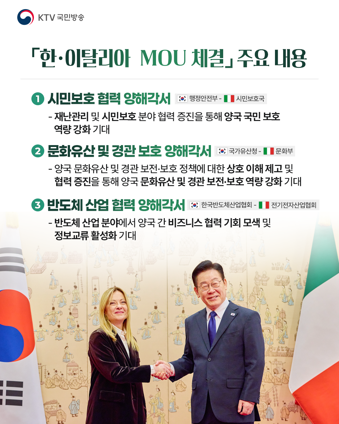 이어 “양국은 재난 예방과 관리, 문화유산의 보호와 보존, 반도체 분야 협력에 관한 양해 각서에 서명하며, 이번 회담의 성과를 통해 양국 간 협력의 폭이 더욱 넓어지고 다방면의 인적 교류가 더욱 활발해질 것으로 기대한다”라고 말했습니다.