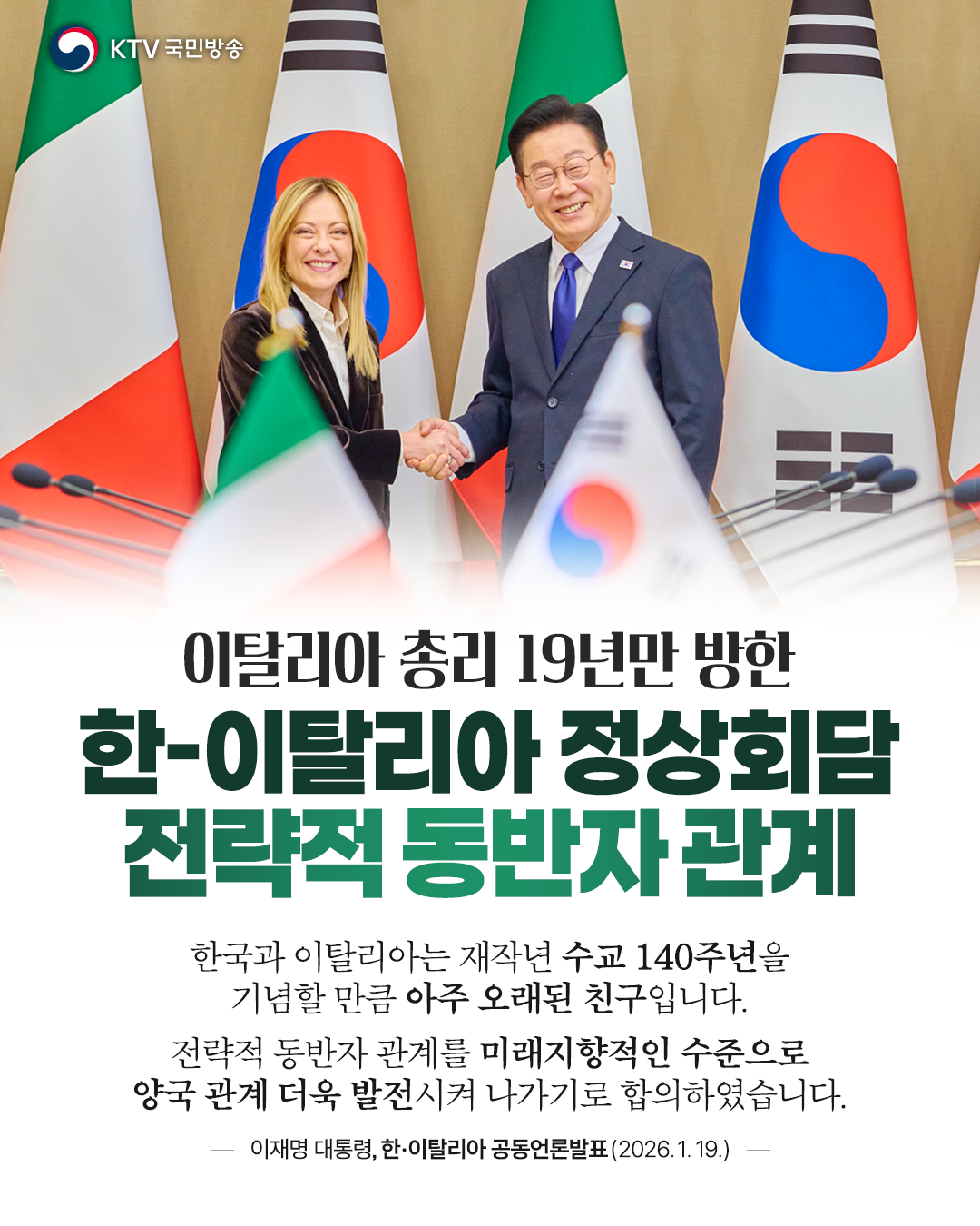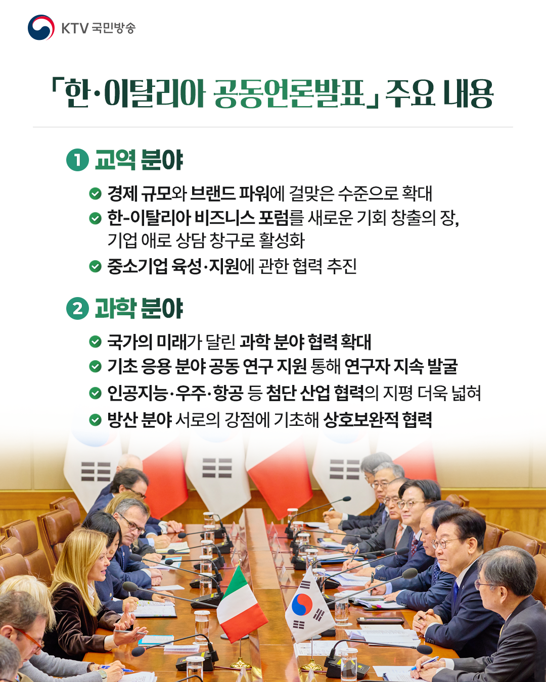 이 대통령 “한국과 이탈리아는 재작년 수교 140주년을 기념할 만큼 아주 오래된 친구이다”라며 “2018년에는 전략적 동반자 관계로까지 승격하게 되었다”라며, “전략적 동반자라는 명칭에 부합하는 미래지향적인 수준으로 양국 관계를 더욱 발전시켜 나가기로 합의했다”라고 밝혔습니다.