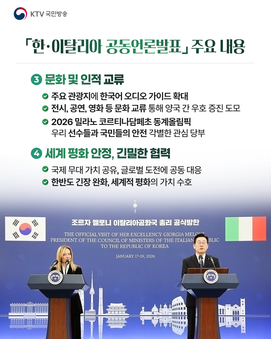 마지막으로 “멜로니 총리님께서 저를 국빈으로 초청하겠다는 의사를 밝혀주신 점에 깊이 감사드린다”라며 “머지않은 시기에 이탈리아를 방문하여 오늘의 건설적인 논의를 거듭 이어 실질적 성과를 만들어낼 수 있도록 기대한다”라고 말하며 공동언론발표를 마쳤습니다.