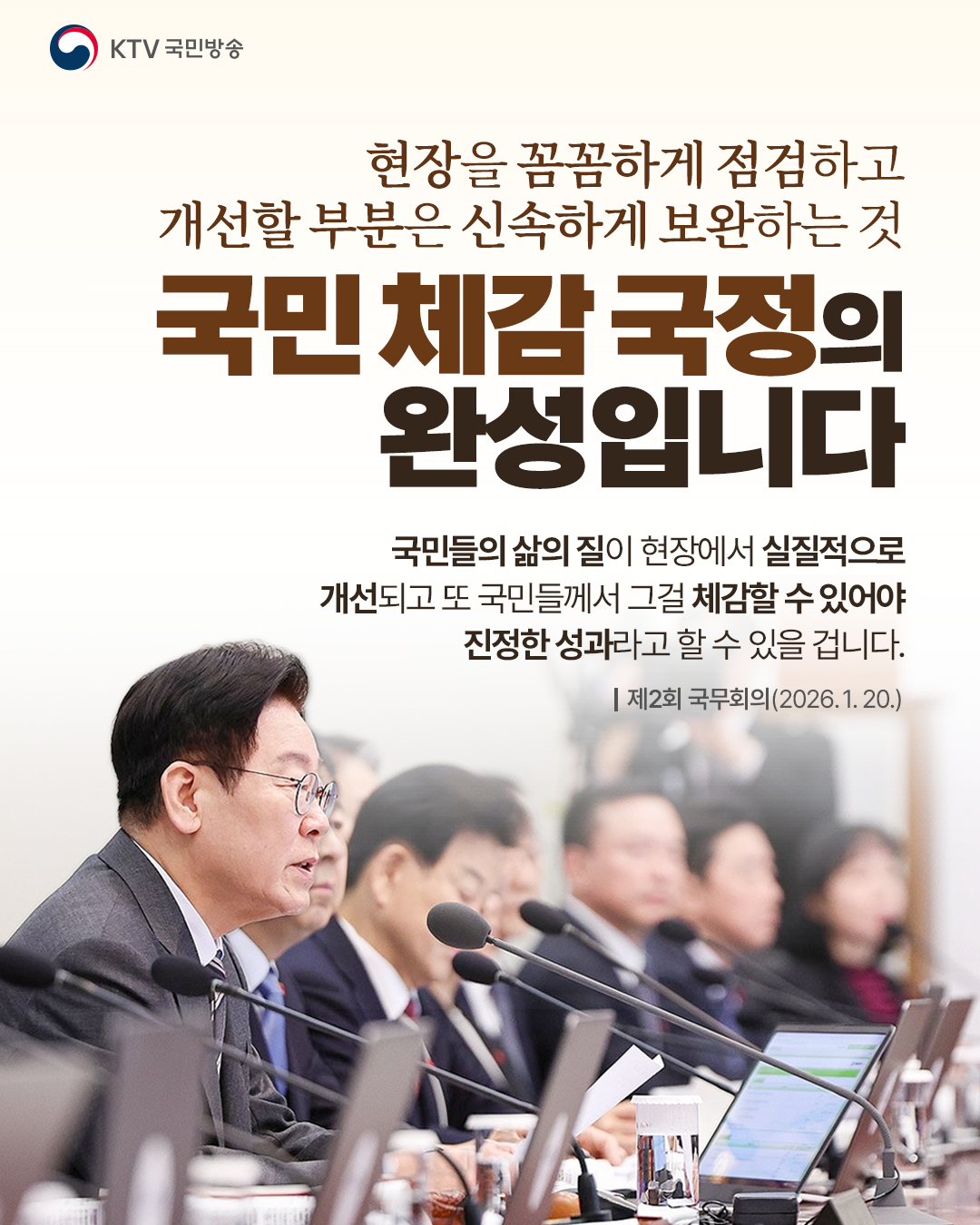 이 대통령은 이날 회의를 시작하며 “2025년도 국정 과제의 만족도를 조사를 했더니 우리 정부의 국정 성과 평가가 2013년 조사 시행 이후에 가장 높다고 한다”라며 “오늘 논의될 2026년 민생 체감 정책은 현장을 꼼꼼하게 점검하고 개선할 부분은 신속하게 보완하는 것이 국민 체감 국정의 완성이라고 할 수 있다”라고 강조했습니다.