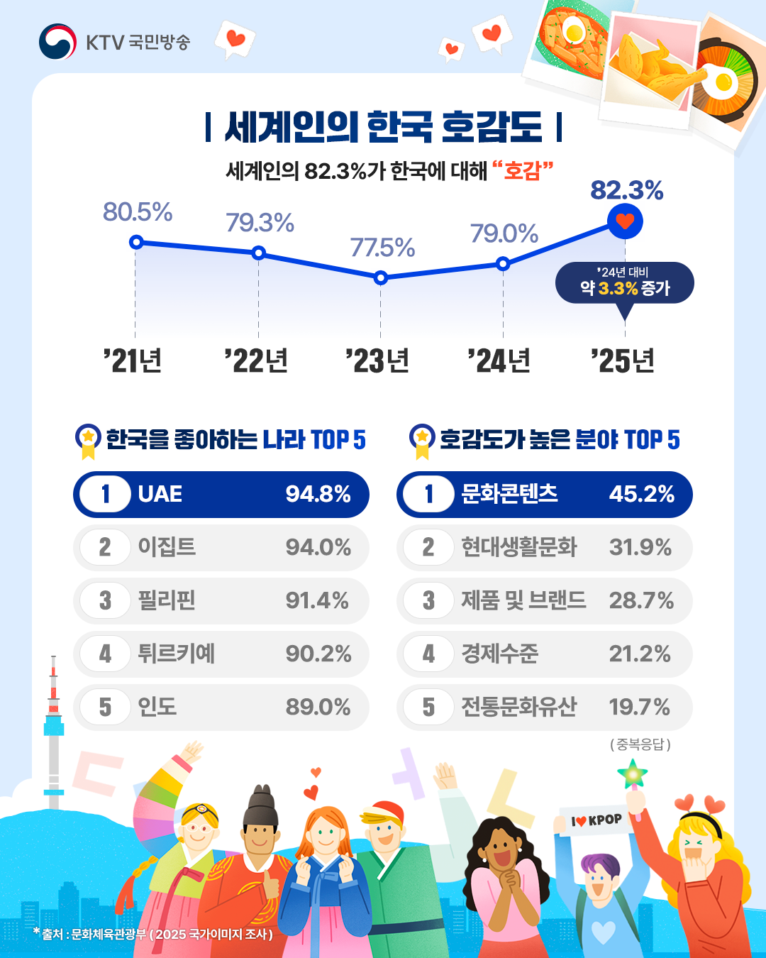 외국인의 한국 호감도는 전년 대비 3.3%p 상승한 82.3%로