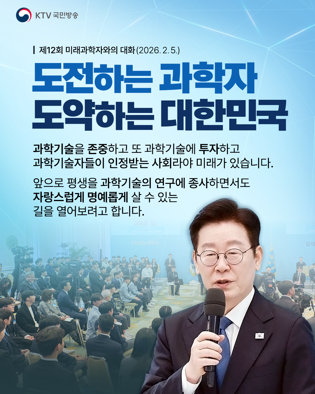 이재명 대통령은 2월 5일 청와대 영빈관에서 ‘도전하는 과학자, 도약하는 대한민국’이라는 주제로 열린 제12회 미래과학자와의 대화에 참석하였습니다.