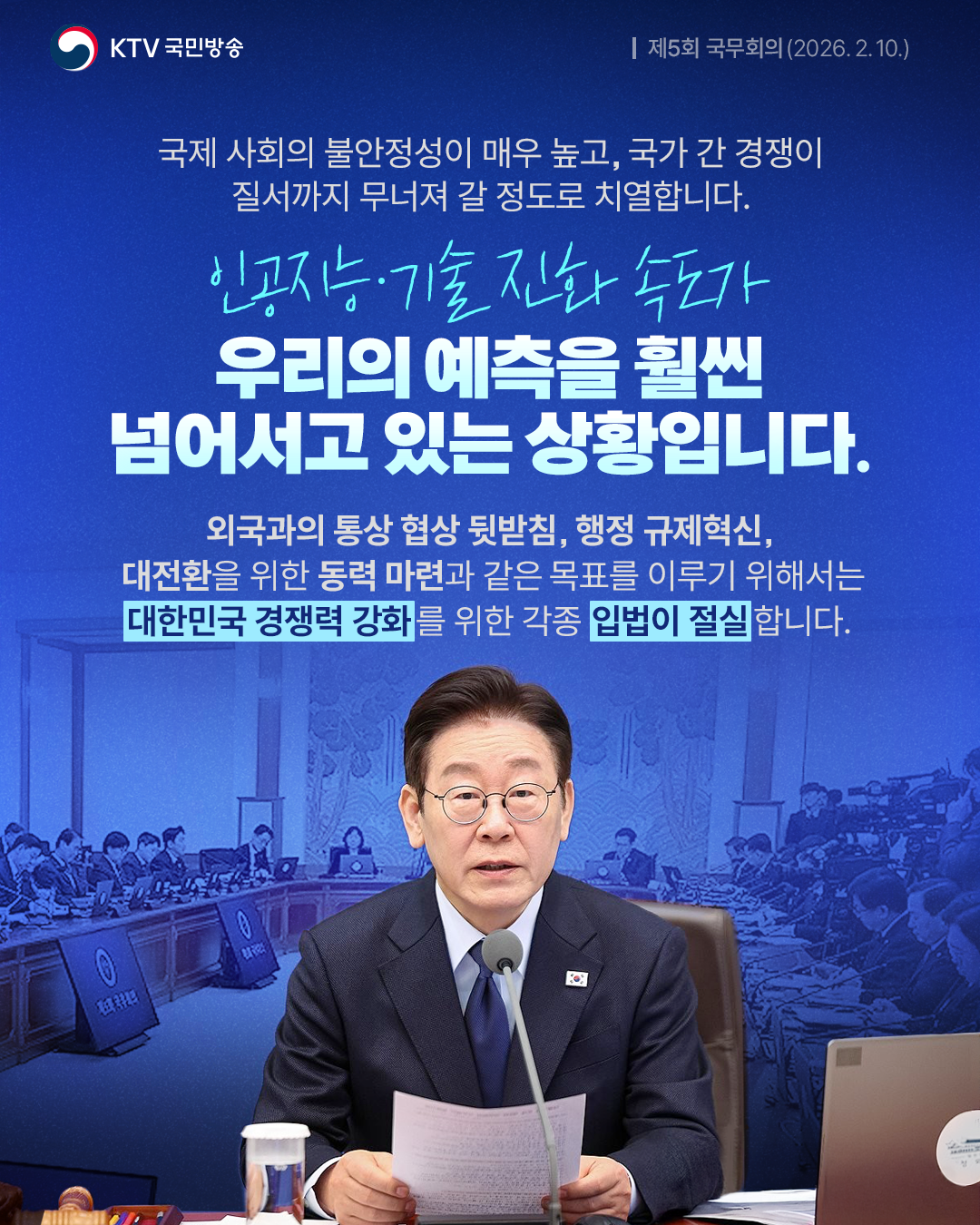 그러면서 “외국과의 통상 협상 뒷받침, 또 행정 규제혁신, 대전환을 위한 동력 마련과 같은 목표를 이루기 위해서는 대한민국 경쟁력 강화를 위한 각종 입법이 참으로 절실하다”라고 국회의 신속한 입법을 당부했습니다.