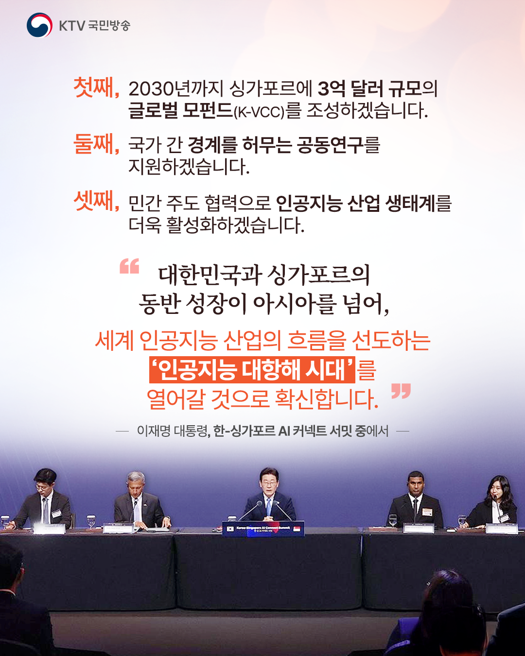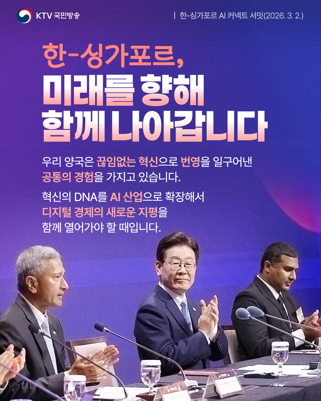 이 대통령은 이날 “우리는 인공지능이 주도하는 거대한 문명사적 전환의 중간에 서 있다”며 이러한 상황 속에 “세계적 수준의 한국과 싱가포르가 손을 맞잡는 것은 필연적이고 또 매우 반가운 일”임을 알렸습니다.