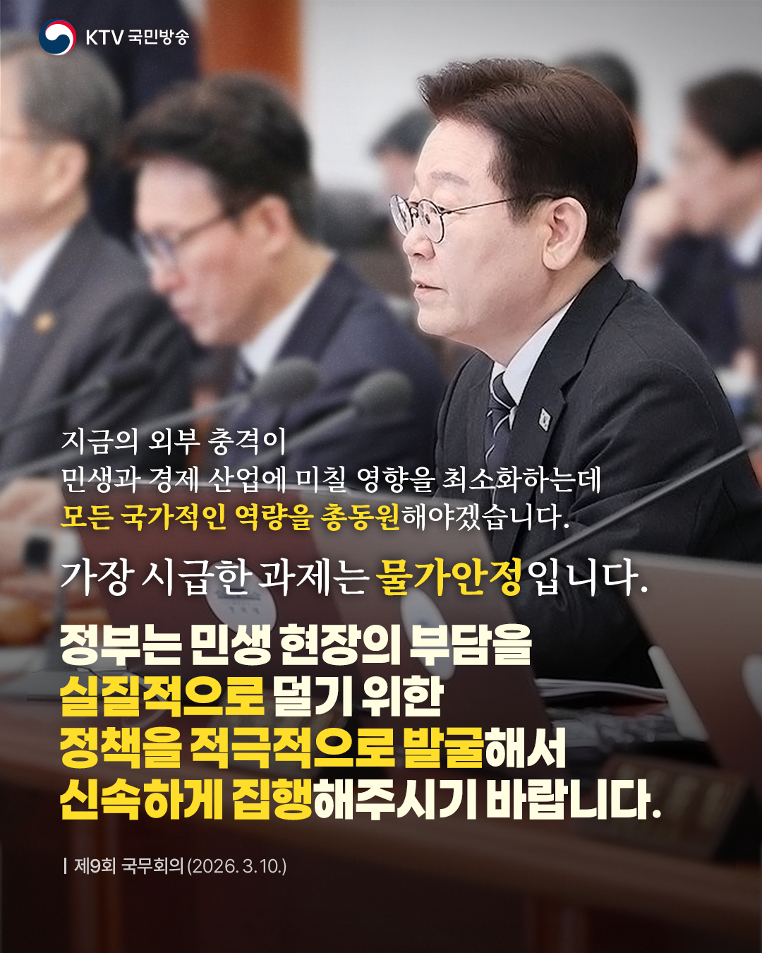 이 대통령은 모두발언에서 “대뇌적으로 여러 가지 어려움이 닥치고 있다”, “위기 상황을 기회의 요인으로 바꾸는 거, 이게 정말로 우리가 해야 될 일”라며 중동 상황에 따른 민생 경제 위기 회복에 관해 언급했습니다.