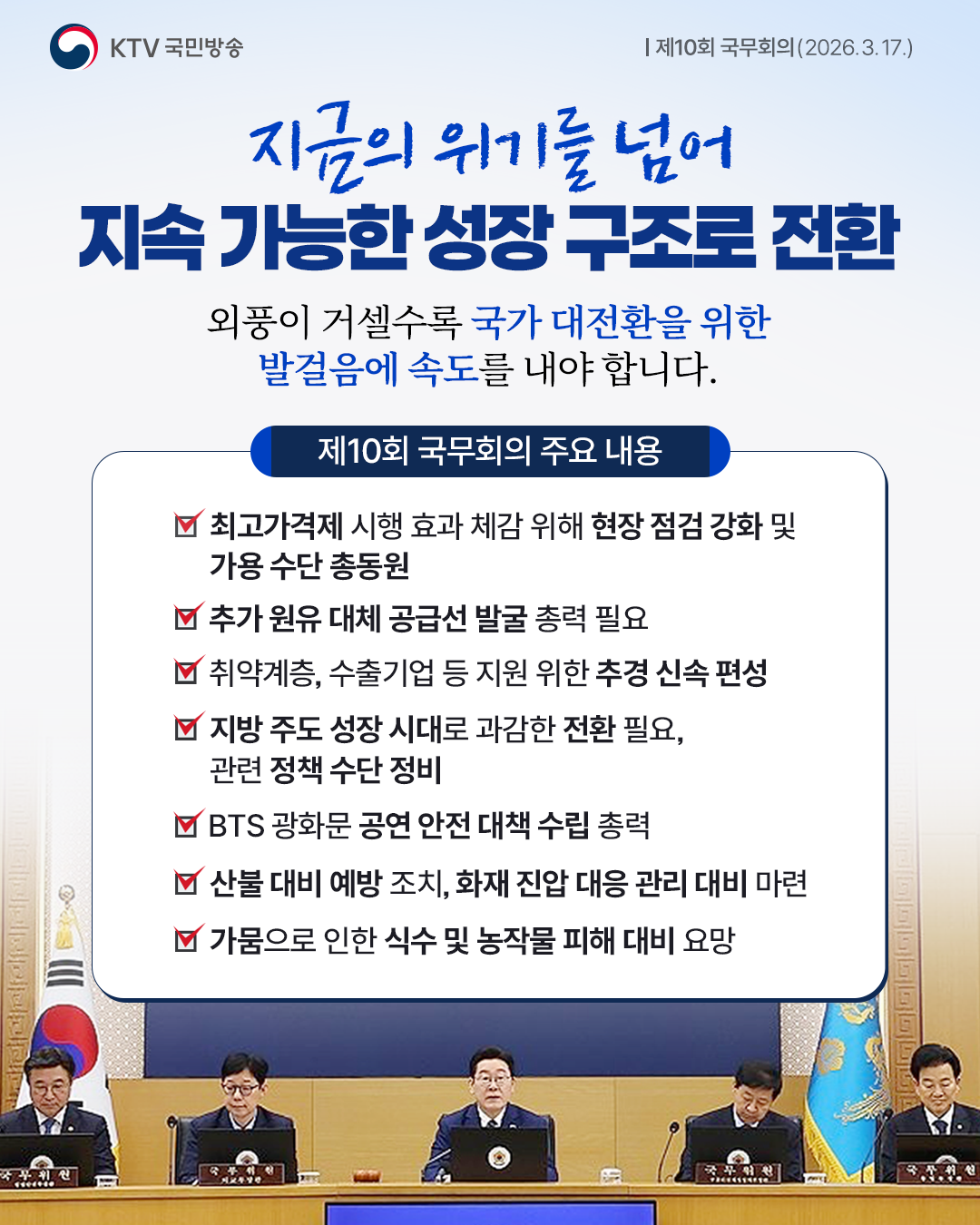 이 대통령은 모두발언에서 중동 상황을 언급하며 민생 경제 안정화를 위해 최근 시행한 최고가격제와 관련해 “중동 상황으로 급등했던 기름값이 석유 최고 가격 가격제 시행 후에 다소 안정되고 있다”고 말했습니다.