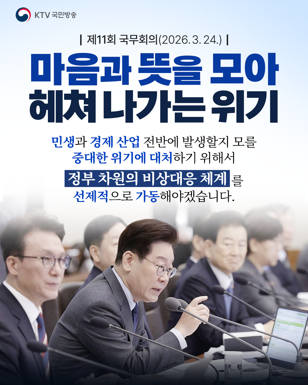 중동 상황 관련 추경에 관해서는 “국민 체감의 원칙 아래 고유가 부담 완화, 민생 안정, 산업 피해 최소화, 공급망 안정, 지방 경기 활성화를 주요 목표로 꼼꼼하게 세부 내용을 설계해 주기 바란다”며 각 부처에 당부했습니다.