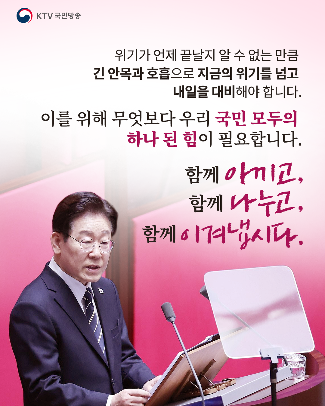 국민에게는 “함께 아끼고, 함께 나누고, 함께 이겨냅시다”라고 전하며 위기 극복을 위한 연대를 요청했습니다.