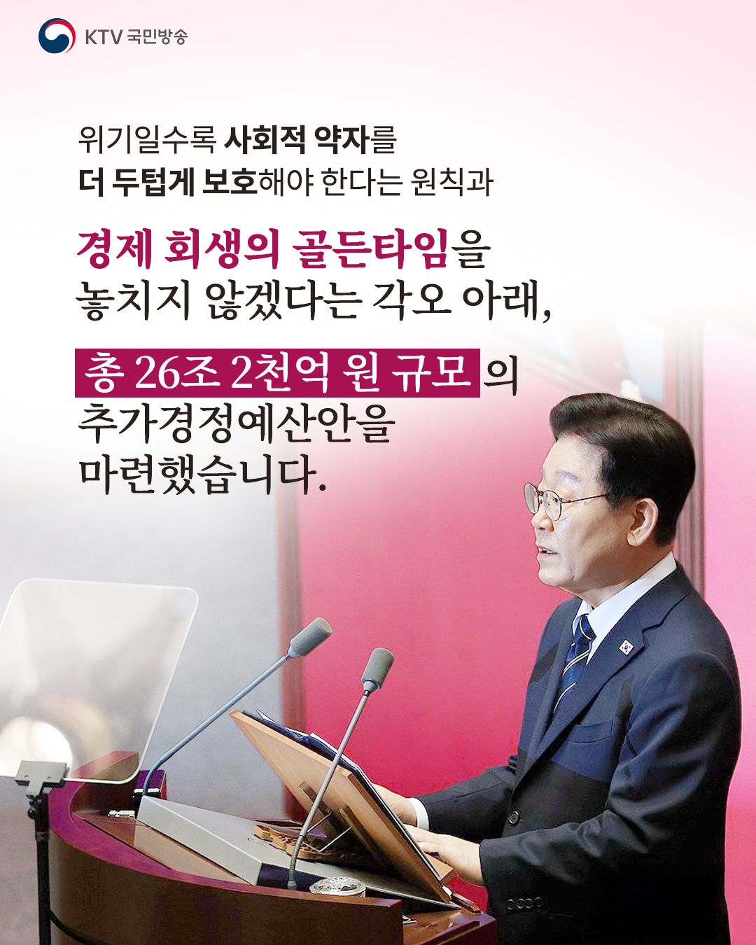 또한 ‘빚 없는 추경’이라는 점을 들며 국채 발행이 없음을 밝혔습니다. 이번 추가경정예산은 증시·반도체 경기 호황 등에 따른 초과 세수 25조 2천억 원과 기금 자체 재원 1조 원을 활용하게 됩니다.