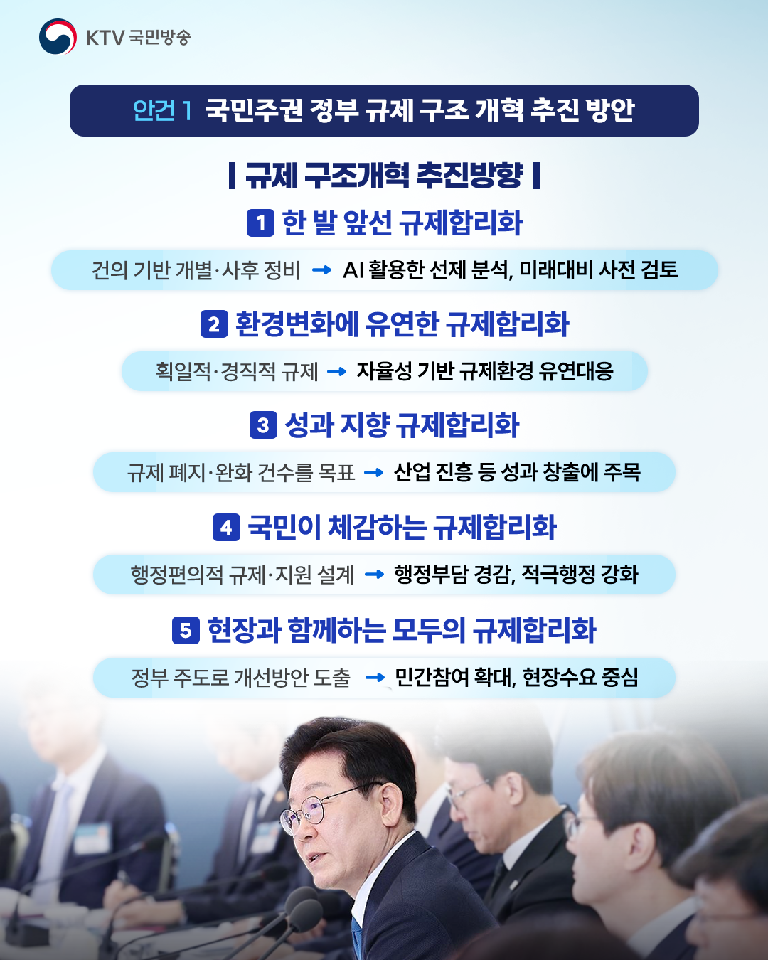 이 대통령은 “우리가 보통 규제 얘기를 하면 규제 철폐 또는 규제 개혁, 규제 강화 이렇게 좀 양분하는 경향들이 있다”라고 말하며 단편적인 규제 개혁의 필요성을 시사했습니다.