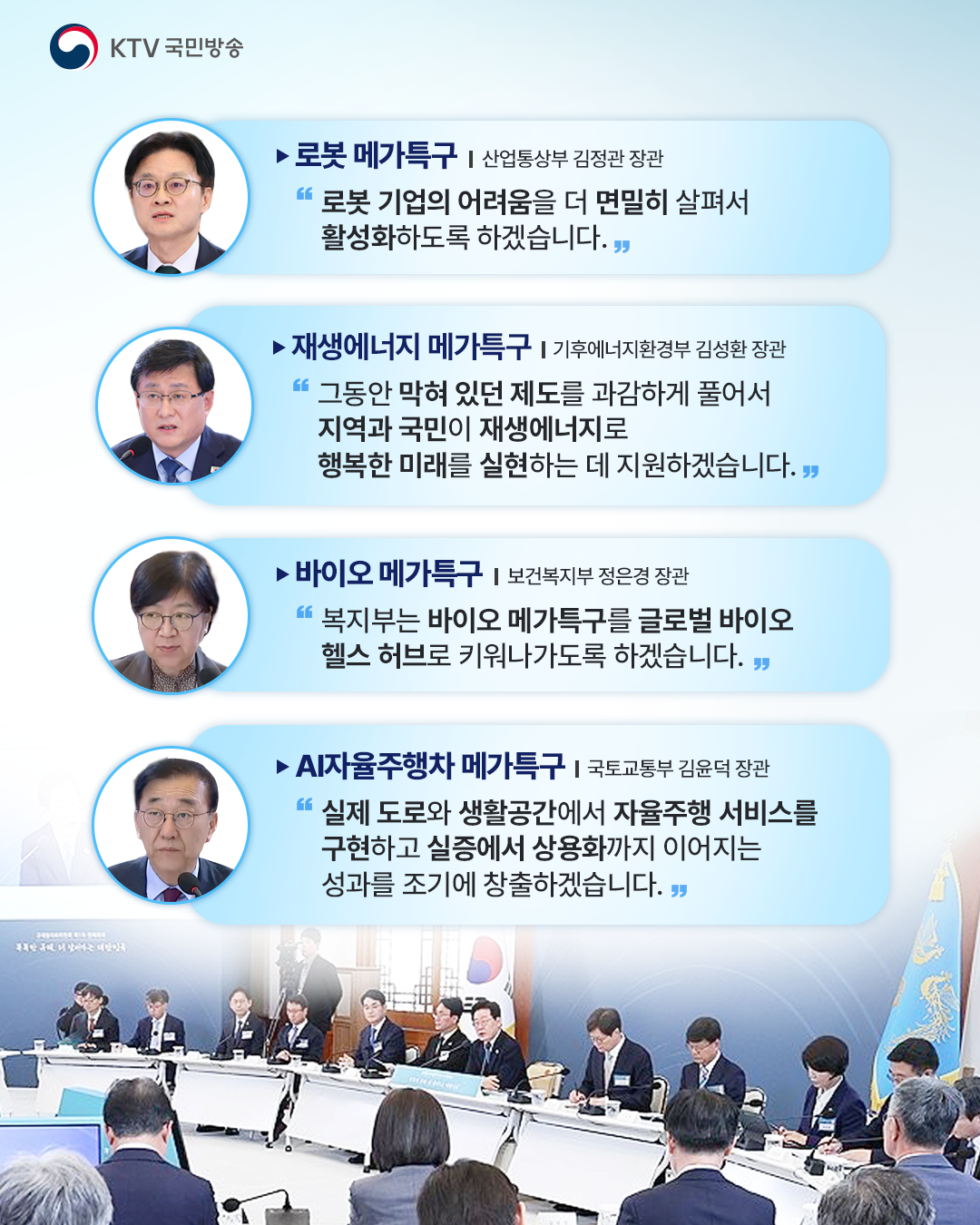 로봇 메가특구(산업통상부), 재생에너지 메가특구(기후에너지환경부), 바이오 메가특구(보건복지부), AI 자율주행차 메가특구(국토교통부)를 구성, 시행 방안에 관해 발표했습니다.