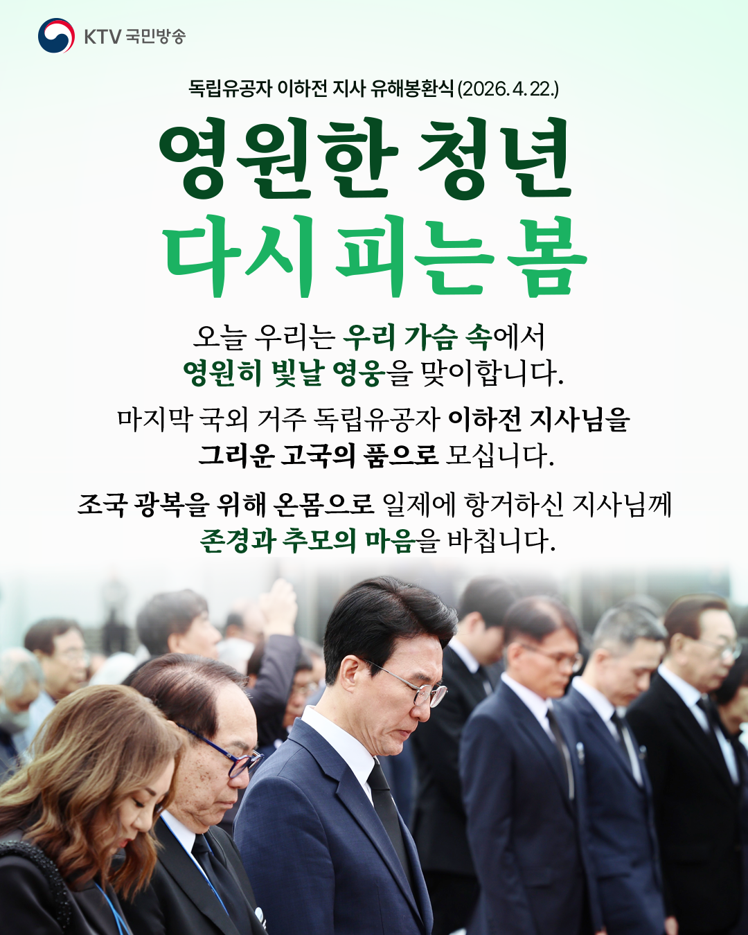 김 총리는 “오늘 우리는 우리 가슴속에서 영원히 빛날 영웅을 맞이한다”라고 하며 이하전 지사의 유해 봉환의 의미를 되새겼습니다.