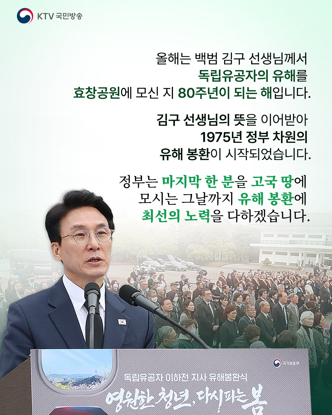 김 총리는 “독립유공자분들을 광복된 조국에 모시는 것은 후손된 우리의 도리이자 의무”라고 하며 독립유공자 유해봉환의 의지를 강조했습니다.