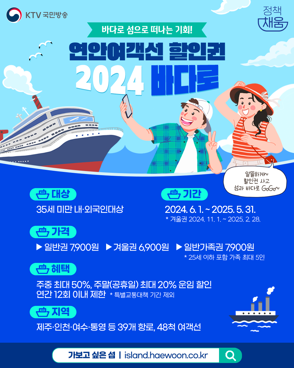 35세 이하의 청년들이 저렴한 비용으로 우리 바다와 섬 곳곳을 여행할 수 있는 연안여객선 할인이용권
